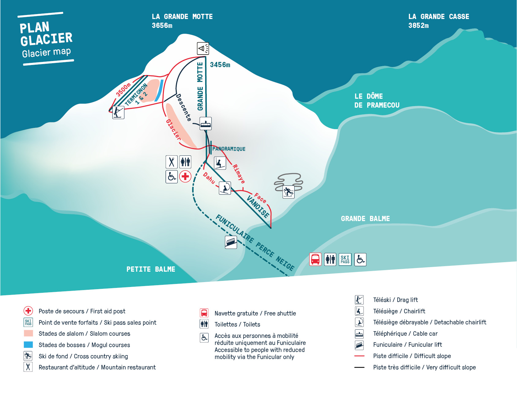 The Grand Motte Funicular runs from Tignes Val Claret up to the Grand Motte glacier, it's a daily service starting at 07:15 and operating until 13:00 (weather dependent).